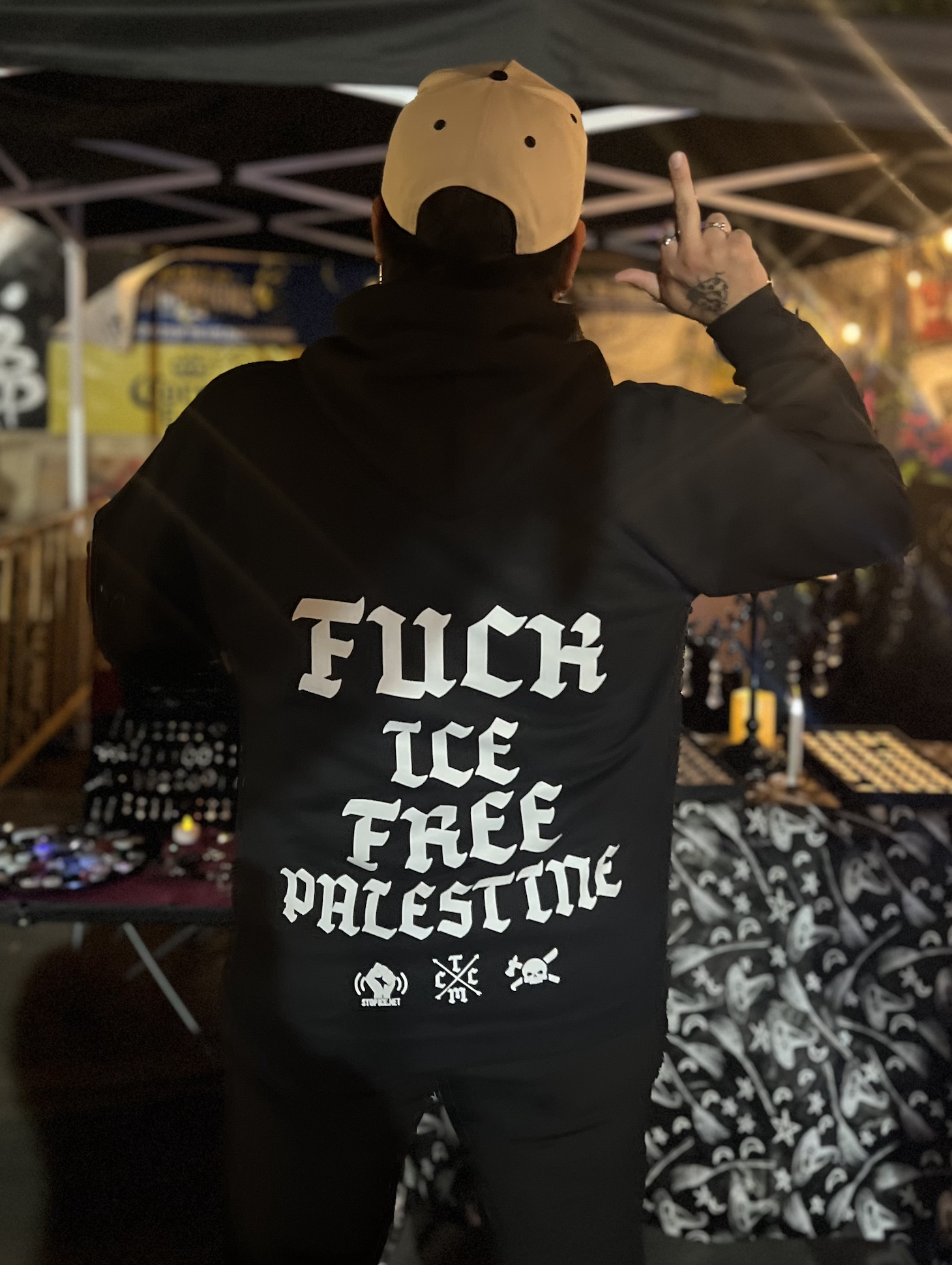 Proceeds benefit StopICE.net and Riverside 4 Palestine.