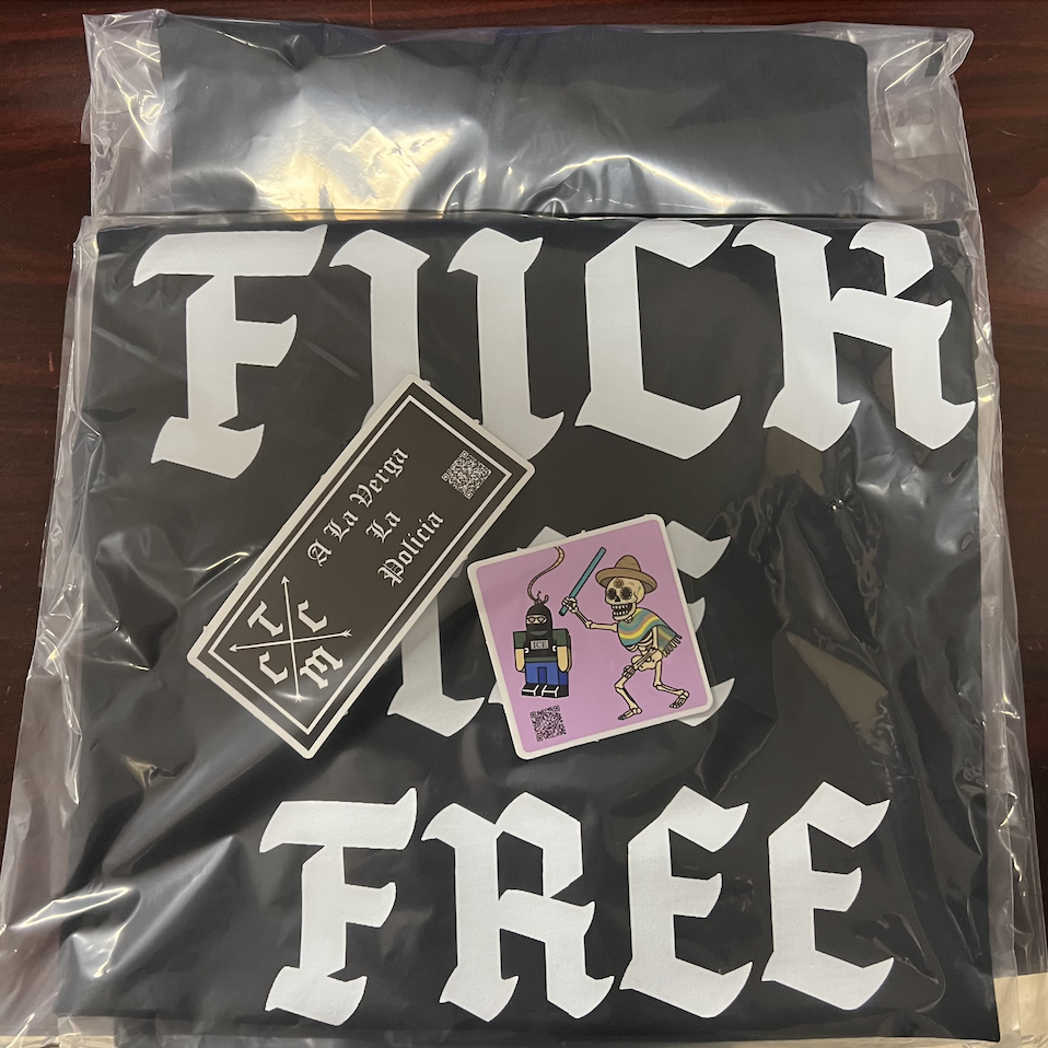 100% premium cotton. Locally pressed and shipped, includes 2 free stickers.